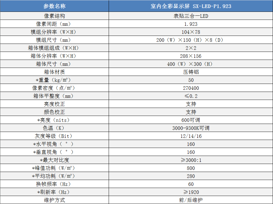 P1.923室內(nèi)小間距高清全彩LED顯示屏技術(shù)參數(shù):