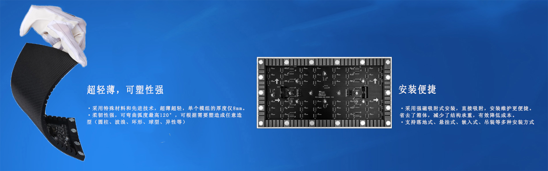 LED無縫拼接軟屏也稱作柔性LED顯示屏,軟模組、柔韌好、任意可彎曲,安裝可以是任意曲面,適合藝術(shù)造型;采用特殊材料和先進技術(shù),超薄超輕,單個模組的厚度僅8mm,不僅輕薄,可塑性強,該系列LED軟模組屬于異形LED大屏,采用可彎曲pcb和硅膠底殼套件,柔韌性強,可彎曲弧度最高120°(適用于圓柱屏、波浪屏、環(huán)形屏、球型屏、彩帶屏弧形屏等顯示場合)