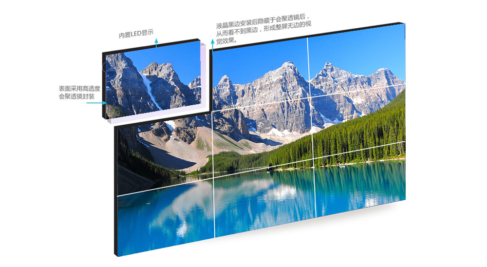 液晶屏正面沒(méi)有拼縫,以及沒(méi)有黑框線條,兩屏之間共用一整條邊縫補(bǔ)償屏跨接顯示,左邊縫補(bǔ)償屏覆蓋右黑框;上邊縫補(bǔ)償屏覆蓋下黑框。完全覆蓋屏與屏之間的安裝物理間隙;采用小點(diǎn)距邊縫補(bǔ)償顯示技術(shù)與液晶顯示單元的完美結(jié)合,使畫(huà)面整體性近似小間距LED產(chǎn)品,畫(huà)質(zhì)、分辨率、成本、色彩還原、維護(hù)等方面大大優(yōu)于小間距LED產(chǎn)品。